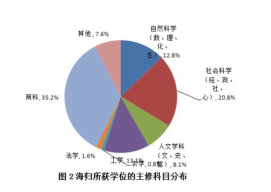 (三)海归在国外所获学位的主修科目以商科、社会科学、工学、自然科学为主,分别占35.2%、20.8%、13.1%、12.8%。此外,人文科学的占比也较高,占比8.1%。农学比例最小,为0.8%。