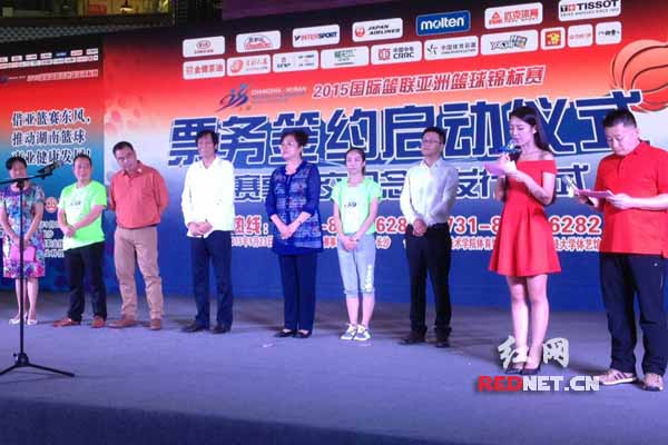 与会嘉宾及湘籍体育明星乐茂盛、凌洁等共同开启了2015男篮亚锦赛票务销售通道并一道在销售票样上签字,共同祝福男篮亚锦赛赛事顺利、票务收入大丰收。这预示着长沙男篮亚锦赛票务销售正式全面启动,目前启动的是票务销售第一阶段小组赛部分场次的门票预售。