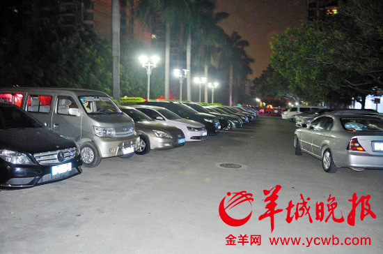 入夜的骏景花园小区共有车位上停满了车