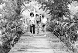 在红色中感受心灵洗涤,在绿色中享受自然风光。踏着乡间小路来到一座吊桥,扶着锈迹斑斑的桥栏杆、踩着晃晃悠悠的木板桥身,害怕中带着一丝新奇。穿过吊桥,再走一段山路便到了温河边。虽然是雨季,但今年降水比往年偏少,河水只浅浅漫过河堤。辛庄在开发乡村旅游后,一些经营者在温河边建设了CS基地、烧烤租赁等,游客来到这里可以一边欣赏山水美景,一边休闲游戏,别有一番情趣。