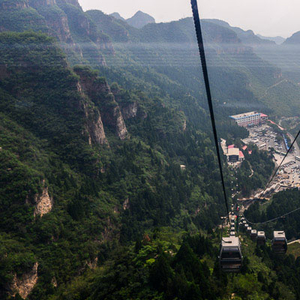 (河北易县狼牙山。缆车上俯瞰整个狼牙山景区。瞻仰五勇士纪念塔,凭吊先烈英灵,加之狼牙山风景秀丽,自然资源丰富,使其成为集爱国主义教育,山岳、溶洞、森林观光为一体的著名旅游景区)