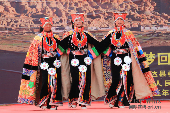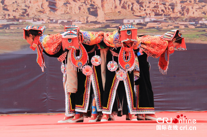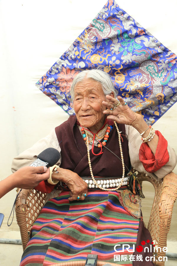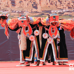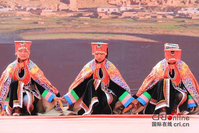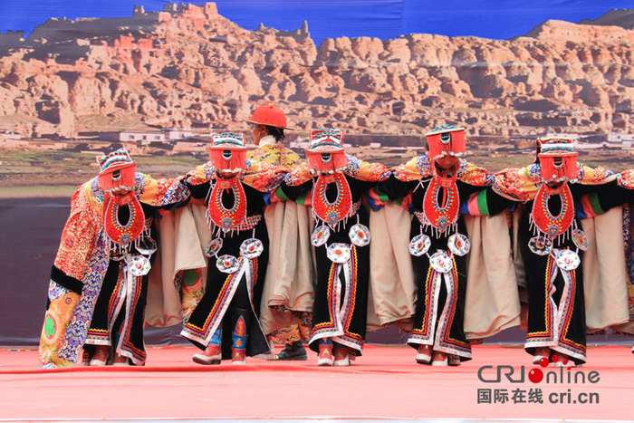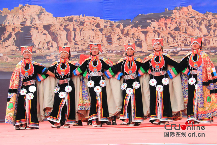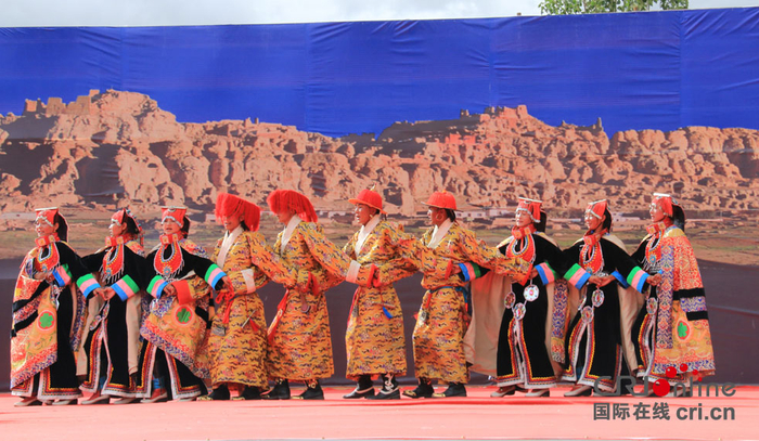 国际在线消息(记者 李瑛):8月8日,在西藏阿里地区札达县的象泉河畔,县民间艺术团的10名年轻舞者,身穿华丽服饰,手挽着手为人们跳起了千年“宣”舞,他们手臂交叠相连,或站成一排,或三人一组,边唱边跳,每个人的脸上都绽放着明媚灿烂的笑容。台下一位老人专注地看着台上的演出,她便是 “宣”舞的传承人,今年已经84岁的卓嘎老人。