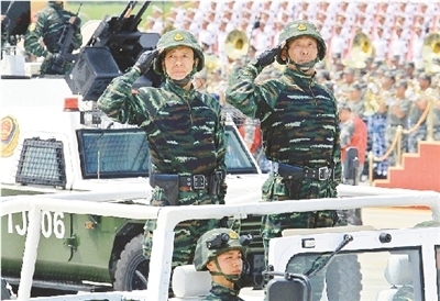 武警反恐突击车方队将军领队孟鸣少将(左)带领方队进行训练(7月26日摄)新华社记者 查春明 摄
