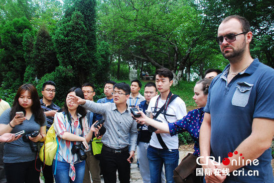 贵阳市图云关森林公园管理处主任杜阳(中)向中外记者介绍图云关的历史和现状。