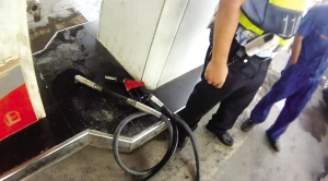 沙区110民警赶到事发加油站看到,一台加油机前的地上,躺着一根被扯断的加油枪,是从加油枪连接部位扯断的。加油机旁边,停着一辆红色的凯越轿车。