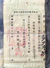 陈家乾的抗战官兵证明书。
