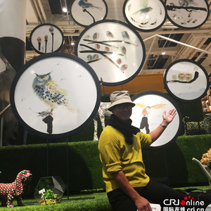 香港街头艺术家苏五云与他的猫头鹰作品合影