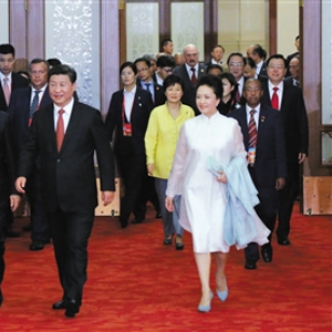 习近平和夫人彭丽媛同参加招待会的外国领导人夫妇共同步入宴会厅。在人民大会堂举行招待会,习近平同中外领导人共同祝愿世界和平。