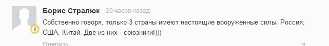 网友“鲍里斯·斯特拉流克”说:“我个人认为,这世界上只有三个真正的军事大国——俄罗斯、美国和中国。而其中的两个是盟友!”