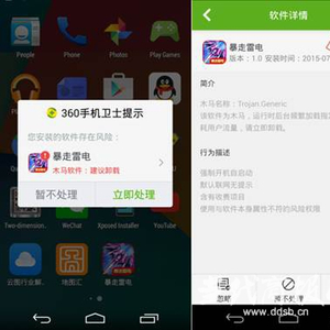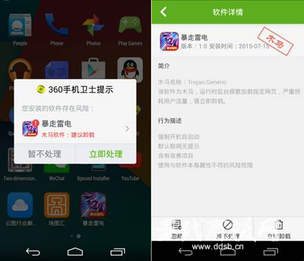 图1:360手机卫士查杀被“流量僵尸”木马篡改的游戏应用