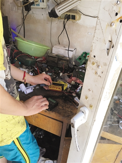 在出租车计价器维修店内,店主正在为顾客调试打票机。