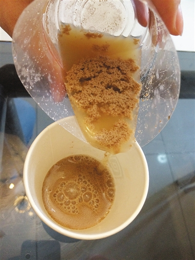 3杯现调奶茶:从奶茶店购买的10元奶茶出现大量絮状沉淀物,水和沉淀物分层较明显;从奶茶店购买的6元奶茶出现少量沉淀物,溶液变得黏稠;从快餐店购买的9元奶茶未出现明显沉淀物。