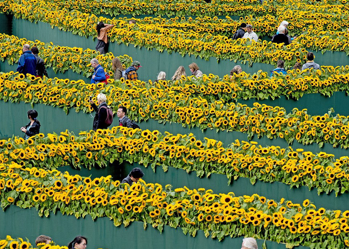 荷兰阿姆斯特丹梵高(Van Gogh)博物馆:为了庆祝这个博物馆开业,入口处摆放了12.5万盆向日葵组成迷宫。(网页截图)