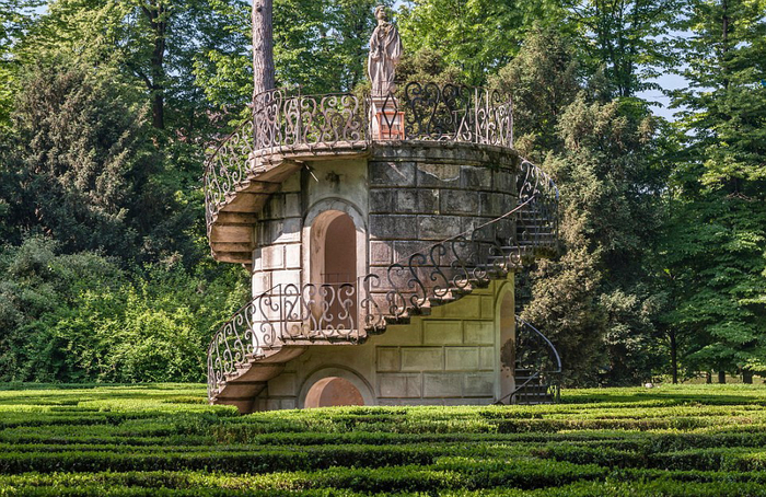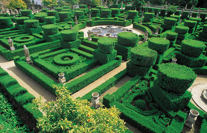 西班牙巴塞罗那奥尔塔迷宫花园(Parc del Laberint d'Horta) :由大量经过精心修剪的柏树组成,入口处有古希腊神话中的人物阿里阿德涅(Ariadne)和特修斯(Theseus)的大理石浮雕,中心部位则是爱神丘比特的塑像。(网页截图)