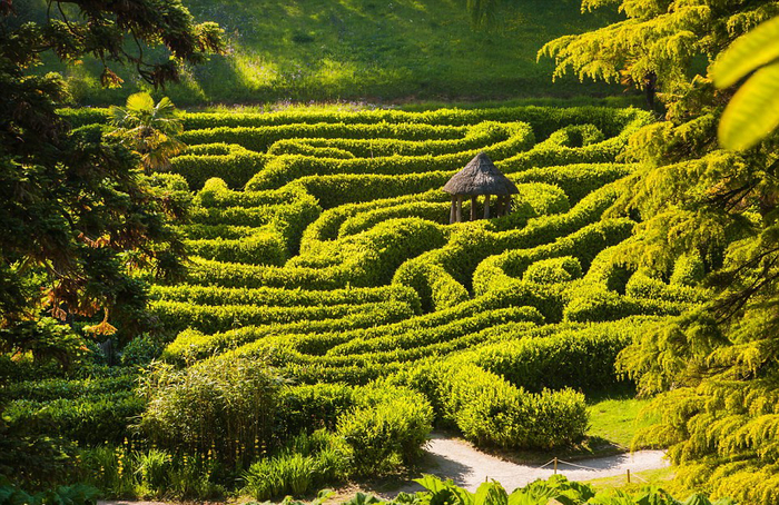 英国康沃尔郡格伦德根(Glendurgan)花园:在穿越格伦德根花园迷宫的3个谷地时很容易迷路,迷宫中间有一个小木屋。(网页截图)