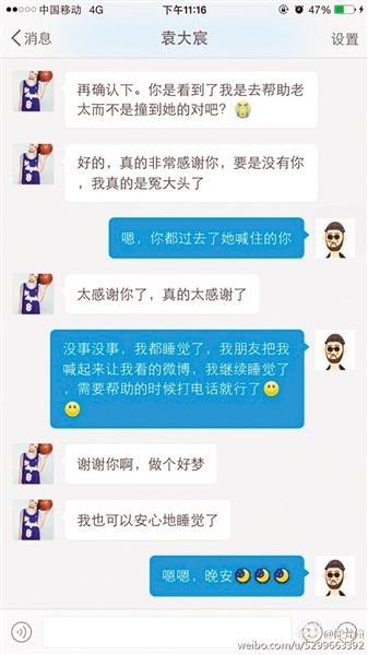 昨日上午9时许,袁晨再次发微博称:“我承认一开始就处理错了,不应该陪阿姨去120,也不应该找朋友来帮忙。但是我一个人,他们两个大人就咬定是我撞的,我怎么解释比较有力?我解释过了,可是他们听进去了吗?当时只有联系辅导员说下午一起去报案。只有找出证据才能证明我没做过,好了,现在揪着说我昨天承认了?我承认了吗?”