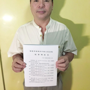 被诬陷而坐牢的陈信滔拿着福州市中院的重审判决书。