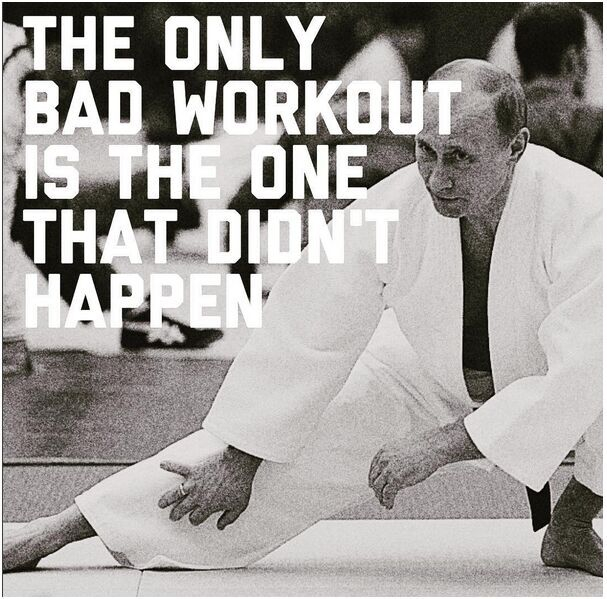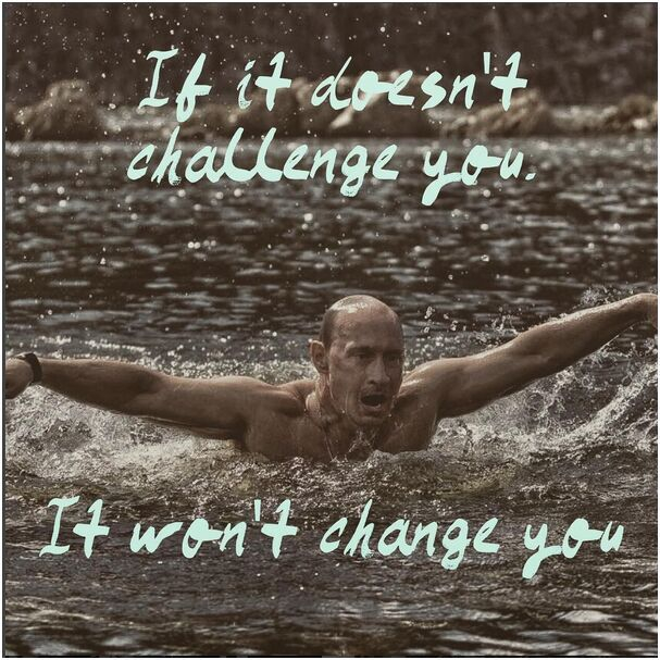 这张照片展现了普京于2009年在西伯利亚的短期休假时用最难的泳姿—蝶泳进行在寒冷的湖中游泳锻炼。在西伯利亚休假期间,他还曾赤裸上身骑马,徒手掰断木棍等。《卫报》记者那时曾写道:“几乎每个月都有普京做这种特技动作的照片出现。”照片中所配的文字是直接从“Fitspiration”中摘录下来的:“如果它无法挑战你,它就无法改变你。”