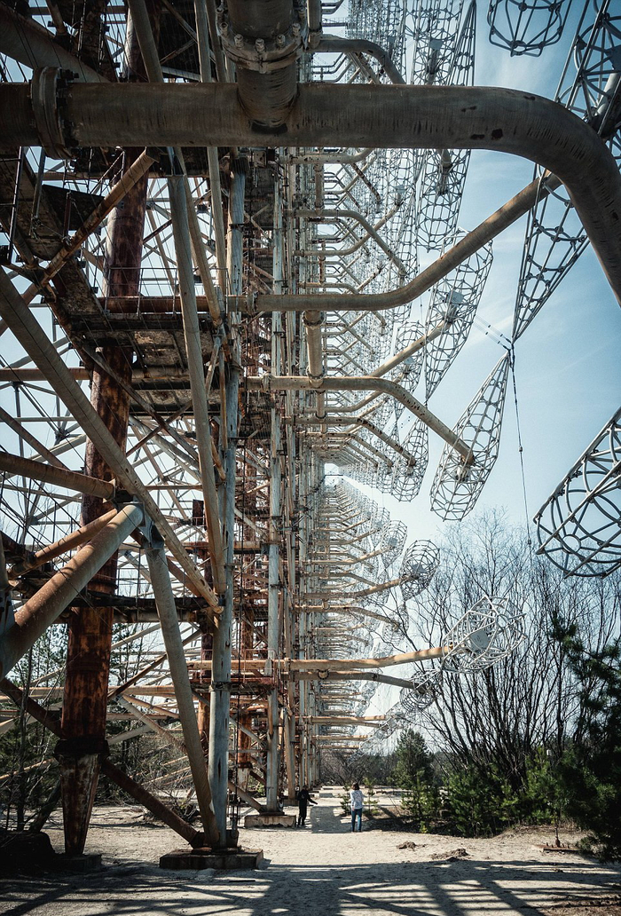 切尔诺贝利核电站对核攻击进行早期预警的雷达系统Duga-1,远处可看到其巨大金属支架。(网页截图)