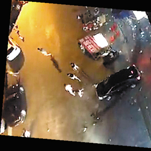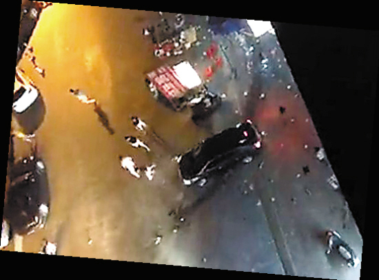 事发时的视频截图,图中黑色轿车正在冲撞人群