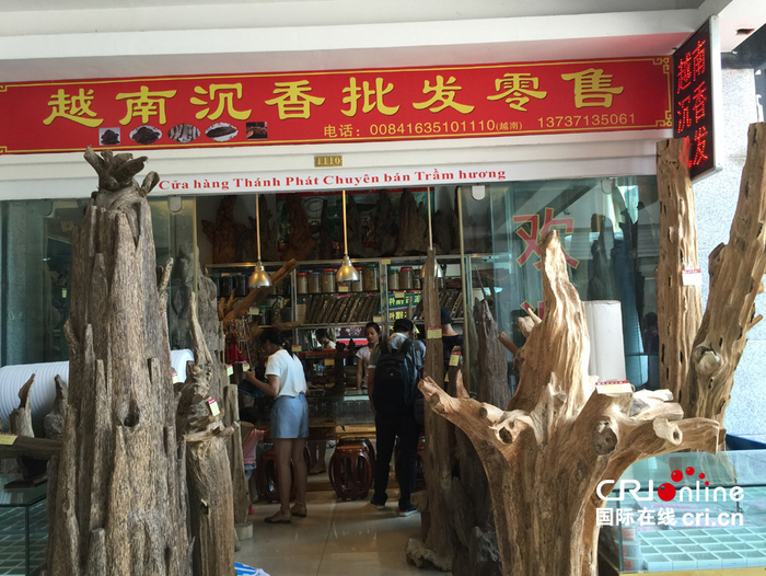 浦寨的发展也给中国和东南亚客商们带来难得的商机。在凭祥浦寨口岸市场里有一家名叫“怡心”的商铺,这里专门批发越南沉香工艺品。老板娘陈美贵是位越南西贡姑娘,她跨越两千多公里的距离到凭祥做生意已经有4、5个年头了,聪明的小陈中文说得很好,生意也是一年比一年红火,不管是实体店还是微店,小陈都用心打理,“我这里专卖沉香的,主要卖给中国人的。我这里开这个店四、五年了,开微信也有几年了,有些老客户他们跟我聊,在上海、北京那里也有老板跟我批发这个东西。他们订货我就发货给他们。(生意还不错)有时候一个月赚几万吧。”