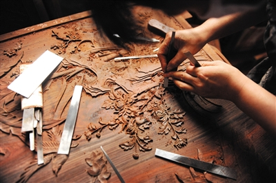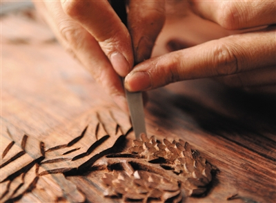 如今机器流水作业的行业中,雕刻成为考验器物是否精美的细节之一。据名佳红木董事长张正基介绍,雕刻要气韵,层次要分明,光滑要和顺,棱角要出清。他介绍说:“苏作家具的雕刻不仅要求圆润流畅,棱角分明,达到形似,而且还要神似,讲求气韵生动。”在行业中,手工雕刻作品被公认为更具鉴赏性和收藏性,其家具则更具有艺术价值。