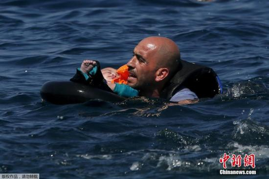 当地时间2015年9月13日,希腊莱斯博斯岛,承载叙利亚和阿富汗难民的一橡皮艇在靠近莱斯博斯岛100米远处泄气,当地民众和志愿者对难民进行了援助,难民们靠救生圈和游泳上岸。