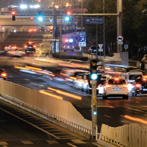 昨晚,广渠门内大街上,每隔两三百米就有一个红绿灯。