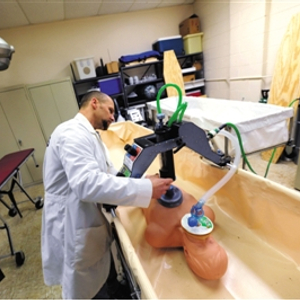CI的工作人员在模拟人体冷冻过程,注射一种特殊的玻璃混合物到要冷冻的遗体里,防止冷冻后,身体里面会结冰。