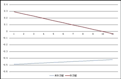 图3:小学阶段参与数学补习与未参加补习两组学生初中数学成绩趋势示意图