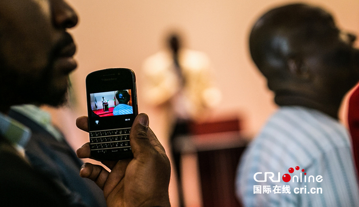 男子用智能手机拍摄会议现场。作为非洲第一大经济体,尼日利亚智能手机需求巨大,越来越多的消费者使用手机上网、拍照和社交。摄影李晋