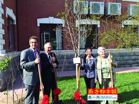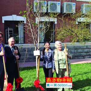 德沃切克夫妇(左二、右一)和长子盖瑞(左一)访问石家庄外国语学校,种下象征友好的玉兰。