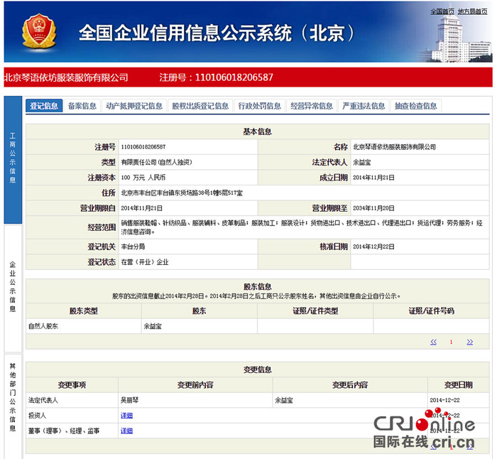 记者登陆国家工商局网站全国企业信用信息公示系统,查询“北京琴语依坊服装服饰有限公司",信息显示其成立于2014年11月21日,经营地址为北京市丰台区丰台镇东货场路38号1幢5层517室,注册资金100万。记者通过多种查询途径目前尚没有找到该公司的真实联系方式。 21日下午,记者到其注册经营地址实地探访,发现丰台区丰台镇东货场路38号院是金泰银丰集团所在地,1幢5层目前是金泰银丰丰台分公司物业管理中心。记者找到517室,发现这里现在是一个洗手间,而38号院内有很多商户租赁使用金泰集团的办公楼,但是在物业提供的所有商户名单中,却找不到琴语依坊的名字。记者又询问了园区内多家商户,都表示不知道该公司。记者在38号院内还找到一栋名为1号的五层居民楼,但全部是普通住户,也并没有517房间。截止发稿,记者经多方联系,仍无法联系到北京琴语依坊服装服饰有限公司。