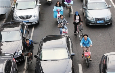对于自行车只能在停放和行驶的小汽车夹缝中前行,昨日,交通委主任周正宇回应称,2015年慢行系统整治,主要治理措施有五方面,其中之一就是要明确自行车路权,确保自行车优先通行空间。