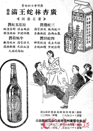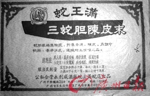 1887年,广州市西新基正中约出现了一家与众不同的店面,门前招牌大书“蛇王满”三个字,店内铁笼内,条条活蛇令人观之不禁有些“胆战心惊”。这是广州第一家专业蛇店,数年之后,这里生产的蛇胆陈皮、蛇胆姜、蛇胆酒、蛇胆追风膏远销海外,“蛇王满”之名家喻户晓。