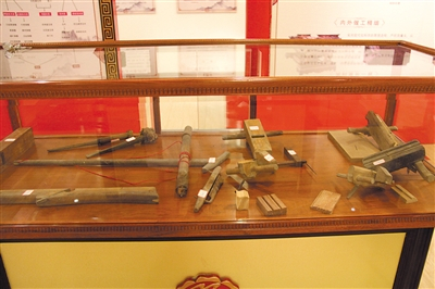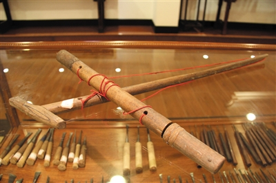 常见的钻孔工具有两种,第一种是拉钻,主要由握把、钻杆、拉杆和牵绳组成。使用时,拉动拉杆,带动牵绳,牵绳与钻杆之间产生摩擦力,使钻杆转动,达到钻孔的作用。主要用来钻直径较小的孔眼。还有一种是螺旋钻,由钻头、螺旋杆和钻柄组成,这种工具钻孔比较深。在开榫的过程中,需要用刀具在木料上切削需要的槽。