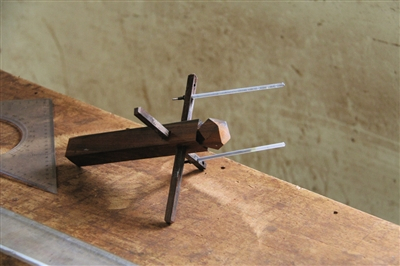 在开料以及钻孔之前,对家具的每一个部位都需要画出小样,用专用的画线工具把各个部位测量并画出来。线画得好,家具尺寸才能做得准,榫卯结构处也才能做到天衣无缝。常用的测量工具有线勒子、墨斗、画线刀等。