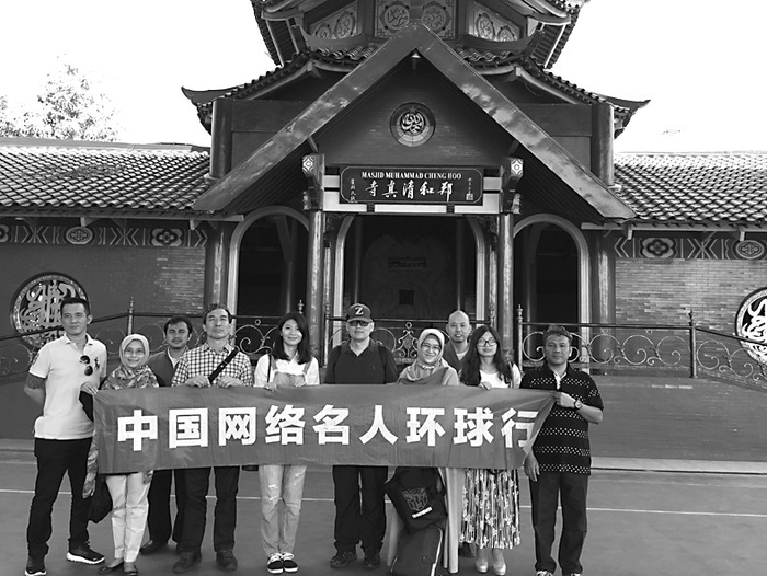 “中国网络名人海上丝路行”成员在印尼泗水郑和清真寺前。
