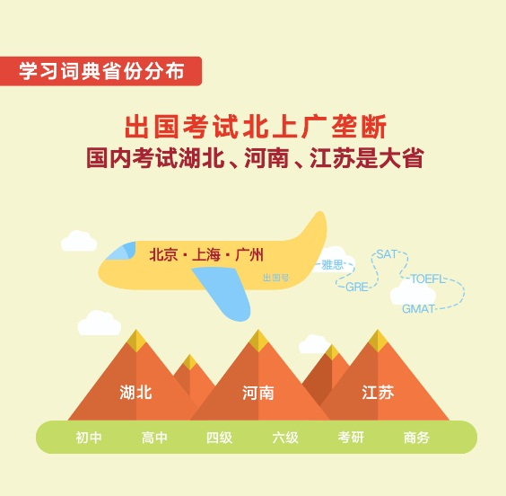 新上线的有道词典6.0发布近一周的时间,有道官方已经对用户使用新版情况做了初步统计,数据显示,雅思、托福、GRE学习词典的用户集中分布在北京、上海和广州一线城市,而如选择考研、六级学习词典的用户主要分布在湖北河南和江苏省份。北上广依然是出国考试核心的需求区域,而盛产学霸的湖北河南等省份用户则更多专注在国内类型的考试中。