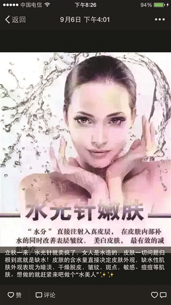 另外,如今在爱美人士中十分风靡的水光针,也成了美甲店的主推项目。在一家美甲连锁店的微信中,晨报记者看到多个关于水光针的宣传,“‘水分’直接注射入真皮层……”“立秋一来,水光针就卖疯了……”