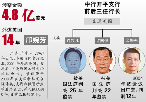 据陈波介绍,2001年中国银行开平支行案发后,开平支行前后三任行长许超凡、许国俊、余振东出逃美国;邝婉芳是许超凡的妻子,涉嫌共同贪污,案发后也藏匿在美国。