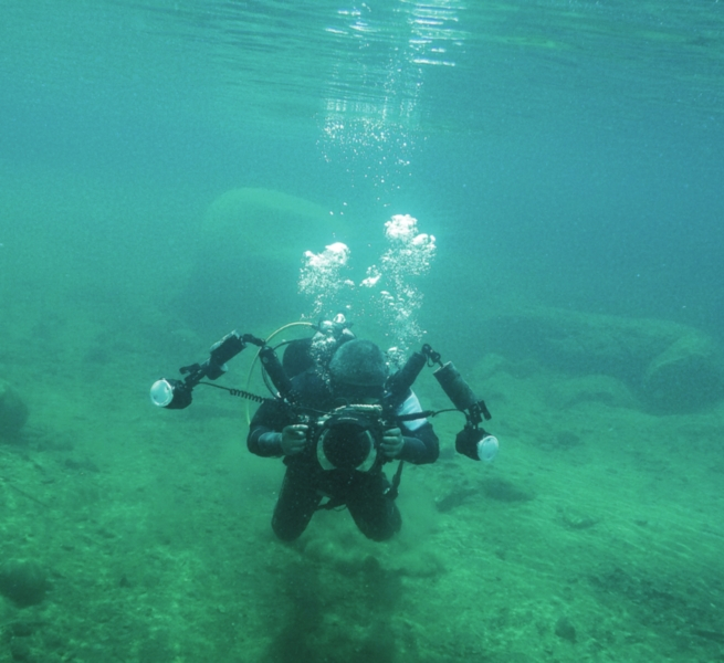 一位潜水员正在做水下潜水镜除雾练习。Abuddy在水下用巨大的水下摄影设备进行拍摄。记者在水下拍摄的潭水里的鱼群。水特别清澈,从水底能看清岸上的人。