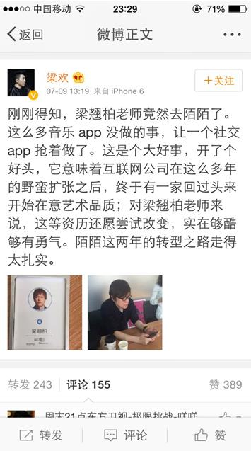 如今,已有2亿用户的陌陌也将玩起音乐自制节目《陌陌现场》——目测也是红了又红的各种音乐真人秀节目。而且并请来了音乐人梁翘柏担纲首席内容官,此人担任过湖南卫视歌唱真人秀节目《我是歌手》和《中国最强音》的音乐总监。