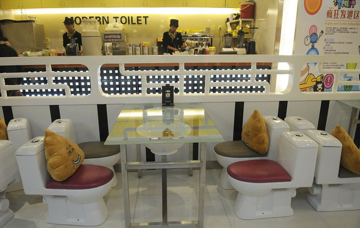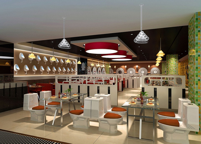 现代厕所主题餐厅:位于台湾和香港的现代便所主题餐厅包含了卫生间里能看到的所有元素。马桶座椅,马桶餐盘,小便池形状的杯子和洗手池形状的桌子。餐厅的屋顶装有喷水头和通便器形状的装饰。餐厅的灯具都是粪便形状。餐厅最初只是提供粪便形状的冰激凌,冰激凌在客人中间大受欢迎之后,餐厅变扩充了粪便形状的其它食物。(网页截图)