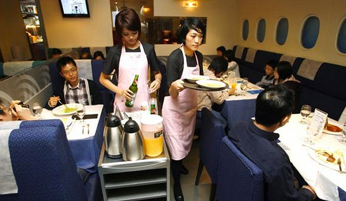 台湾A380航空主题餐馆:位于台湾的A380航空主题餐馆具备了所有飞机上的元素,包括飞机座、安全带和椭圆形机窗等,给客人带来非常逼真的在乘机中享受美食的体验。女服务生们统一着空姐服,用金属推车为客人提供各种西式菜点。餐馆员工都必须接受真实飞机上的空姐要接受的培训。(网页截图)