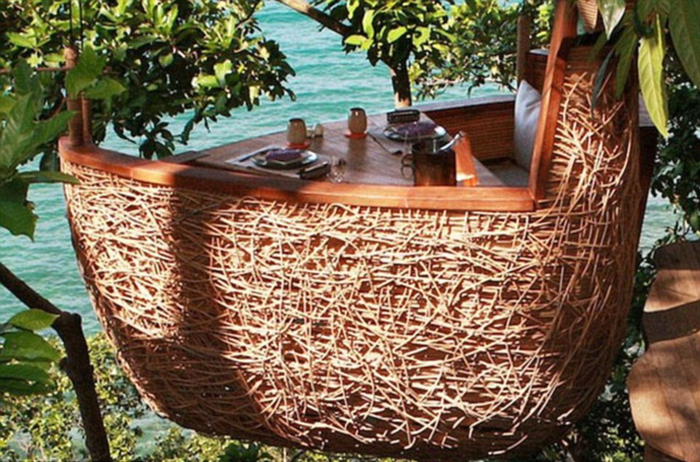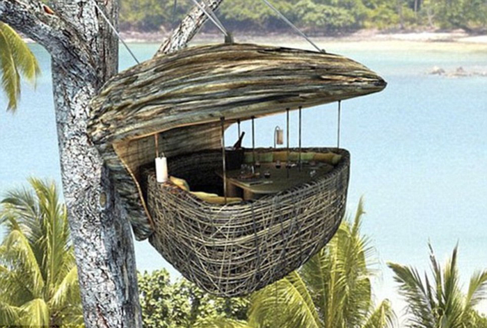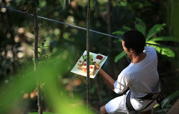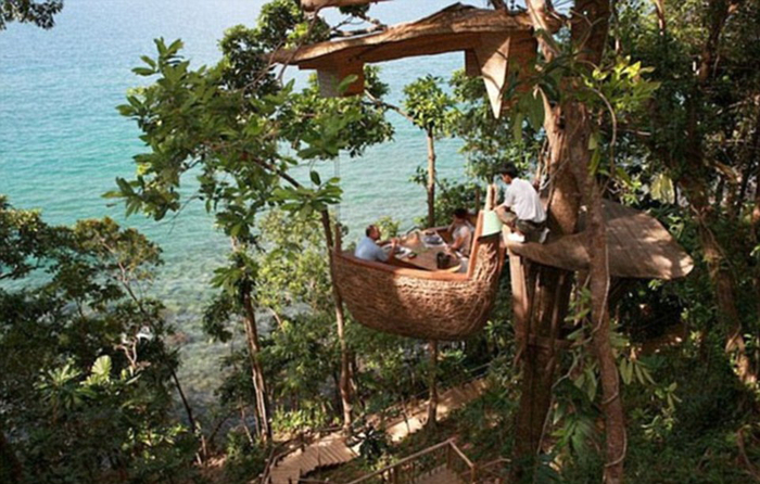 泰国树荚餐厅:树荚餐厅位于苏尼瓦奇瑞度假村(Soneva Kiri)。在这里用餐的客人在食物上来之前就被送到约离地5米处的树顶,从高处欣赏海湾美景。送餐的服务员用滑行索将食物送给客人。餐厅希望以此帮人们实现爬上树冠的愿望。(网页截图)