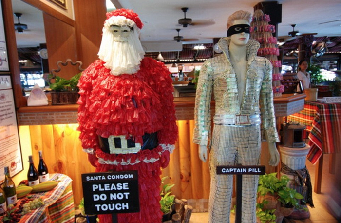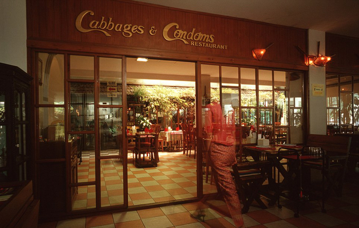 泰国卷心菜与安全套主题餐厅:位于泰国曼谷的卷心菜与安全套餐厅由泰国前政治官员米猜·威拉瓦亚(mechai viravaidya)创办。餐厅创立的初衷是向公众普及性健康和艾滋病预防等社会问题。餐馆宗旨是“我们的食物不会让你怀孕”。餐厅提供的是传统的泰式食物,门口立着由避孕套制成的圣诞老人以及避孕药制成的美国队长形象。餐厅鼓励客人在用餐结束后区餐厅的收银处领取安全套或关于艾滋病预防的宣传单。(网页截图)