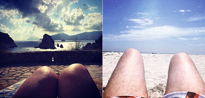 左图为女模特海蒂·克鲁姆的ins照,右图的小伙则用多毛的大腿模仿得不亦乐乎。(网页截图)