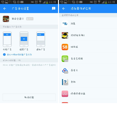 在实际的操作中,用户只需打开广告拦截功能,净化大师便能在后台对移动广告进行主动拦截。一旦监测到某款App会有广告推送,便会加入监控名单,在后台自动进行拦截,和净化大师独有的“应用主动净化技术”如出一辙。在拦截的领域既包括游戏App、小说App等等这些推送广告众多的APP,也涵盖了这些APP当中的内嵌广告、插屏广告、通知广告这各种类型的广告,净化大师可以说是同类产品中对各类型广告拦截最为彻底的应用。