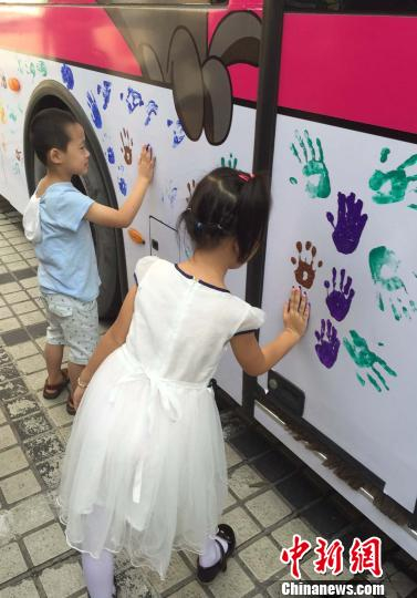 10月1日,绘有“盼盼”原型巴斯官方卡通形象“0BASI(欧巴斯)”的“熊猫巴士”成为厦门首辆手绘公交,并举行发车仪式。发车仪式上,孩子们在手绘公交上印上自己的手印 陈悦 摄